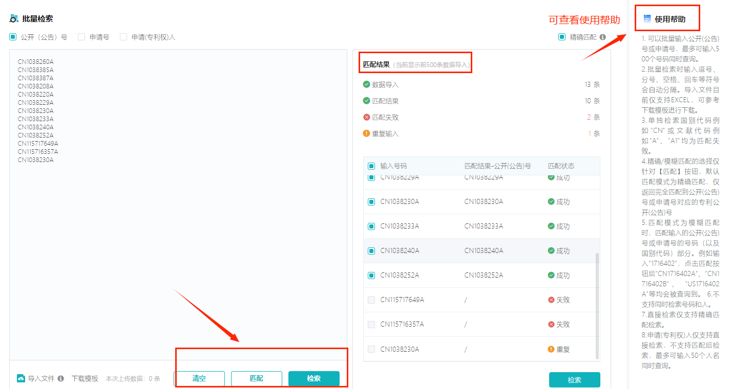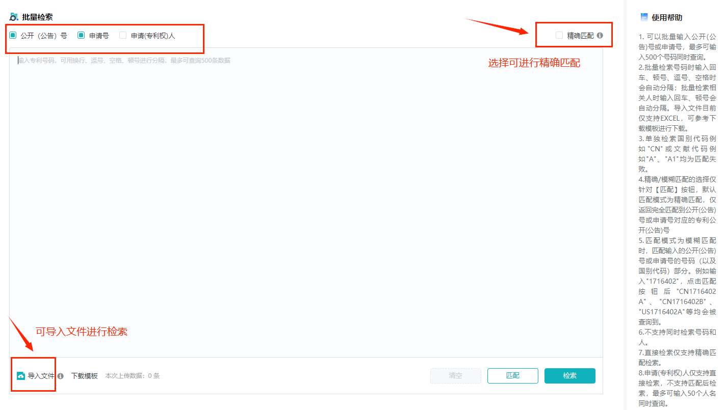 摩熵专利数据库支持批量检索,允许用户一次性输入最多500个公开(公告)号、申请号、申请(专利权)人信息进行检索。同时,支持上传xlsx/xls格式文件进行数据批量输入。