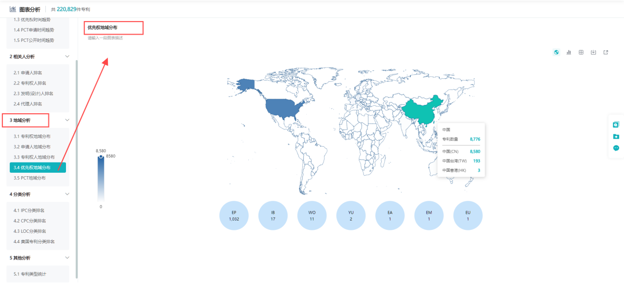 地域分析,提供了专利权、申请人、专利权人、优先权以及PCT地域分布的地图和排名柱状图,使用户能够清晰地看到专利在不同地域的分布情况。