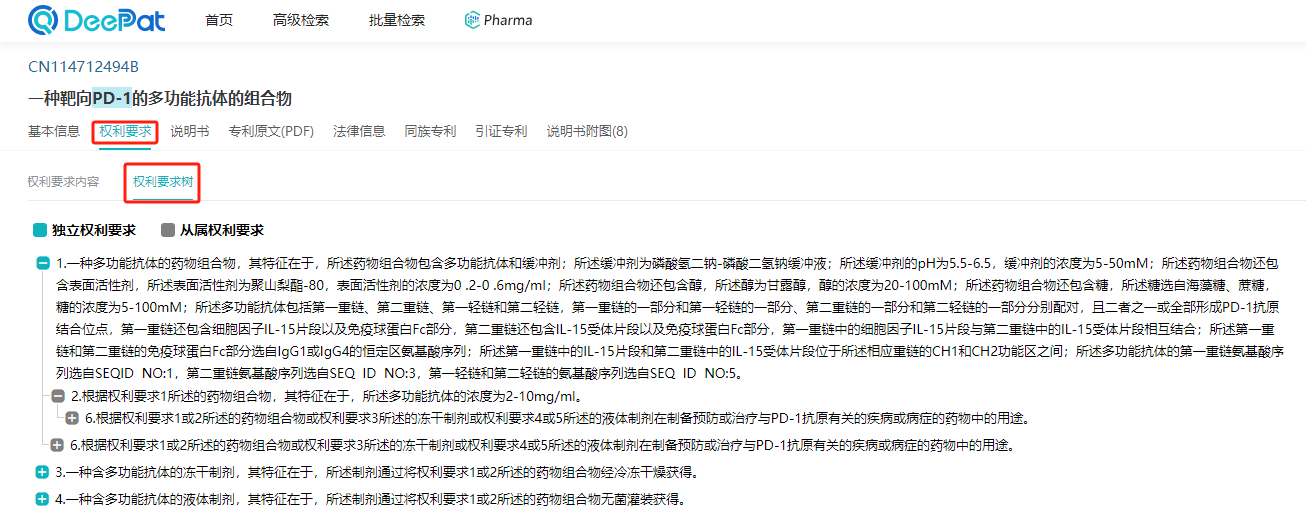 权利要求部分,清晰展示专利各项权利要求文本及权利要求树。通过权利要求树可清晰看出独立权利要求以及旗下所含的从属权利要求项,方便用户确定专利保护范围和需求分析。