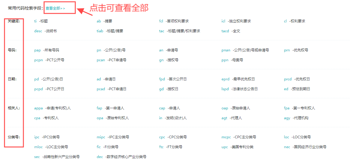 除常用字段以外,还有所有可支持的字段检索,用户可根据自身实际需要进行更复杂的组合检索,具体内容如下图所示(通过常用代码检索字段旁边的"查看全部"即可查看,或在帮助中心也可直接查看)。