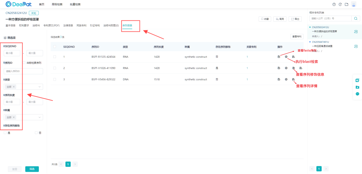 序列信息部分,可查看当前专利中所包含的全部序列信息。这些信息以列表形式清晰呈现,列表详细列出了SEQIDNO、序列ID、类型、序列长度、种属、存在序列修饰以及关联专利等关键字段,为用户提供了丰富的序列数据支持,便于进行深入的序列分析和比对......