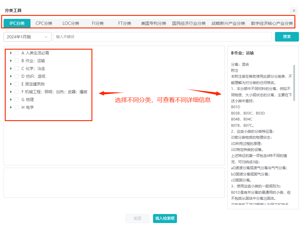 高级检索页面针对各类型的分类号均设计了专门的分类查询工具,用户无需在庞大的分类号体系中盲目搜索,而是可以通过工具快速定位到所需的分类号。同时,还支持勾选多个分类号填入检索框中进行检索,使得用户能够更全面地获取相关专利信息。