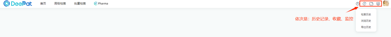 此外,在数据库首页界面右上方,用户还可以便捷地访问多个核心功能板块,包括历史记录、收藏功能、监控功能以及导出功能等。