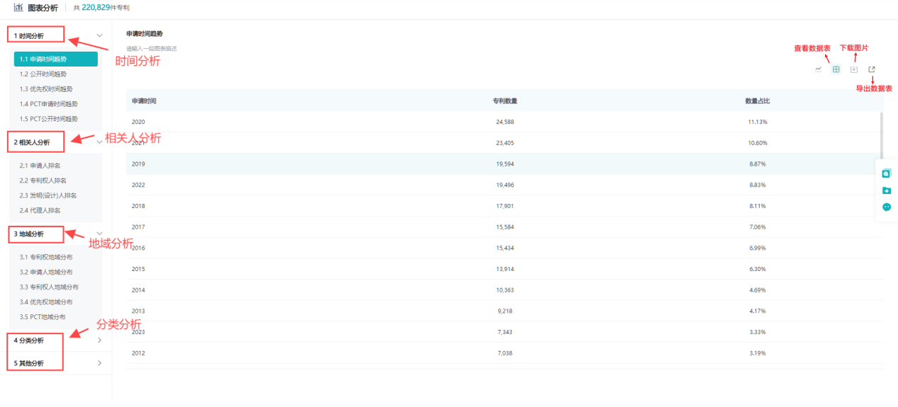 时间分析,用户可以查看申请时间、公开时间、优先权时间、PCT申请时间以及PCT公开时间的趋势折线图,从而直观地了解专利随时间的变化情况。
