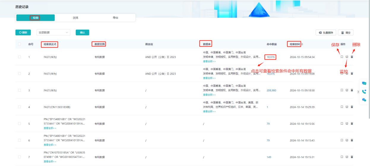 历史记录板块,包含检索历史、浏览历史和导出记录。通过检索历史,用户可以回顾过往的检索表达式、数据范围、命中数量及检索时间,浏览历史则记录了用户浏览的内容及时间,以上记录均支持查看、保存、监控和删除。导出历史允许用户查看已导出的检索内容、时间及数量,并提供下载和删除功能。
