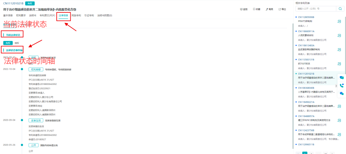法律信息部分,实时更新专利的当前法律状态,并通过法律状态事件轴,让用户清晰了解专利的法律历程。用户还可便捷跳转至欧专局外链,深入探索该专利的引用或被引用详情,进一步拓宽研究视野。