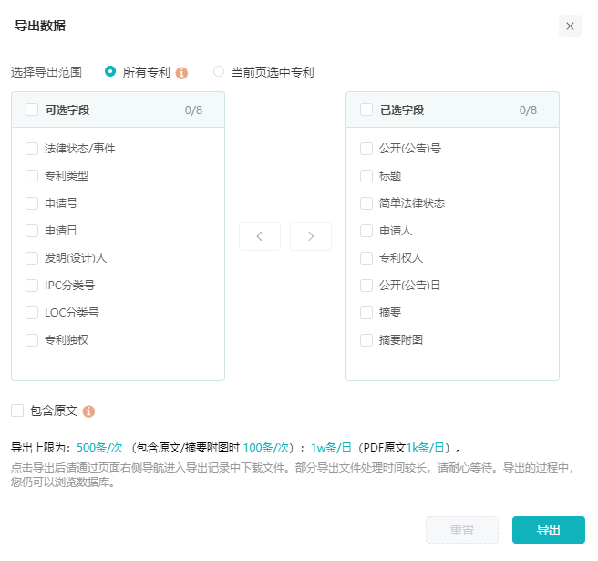 导出功能,则遍布于列表页及其他功能板块,用户只需点击“导出”按钮即可进入导出页面,根据个人需求选择导出的字段及是否包含原文,实现数据的灵活导出。