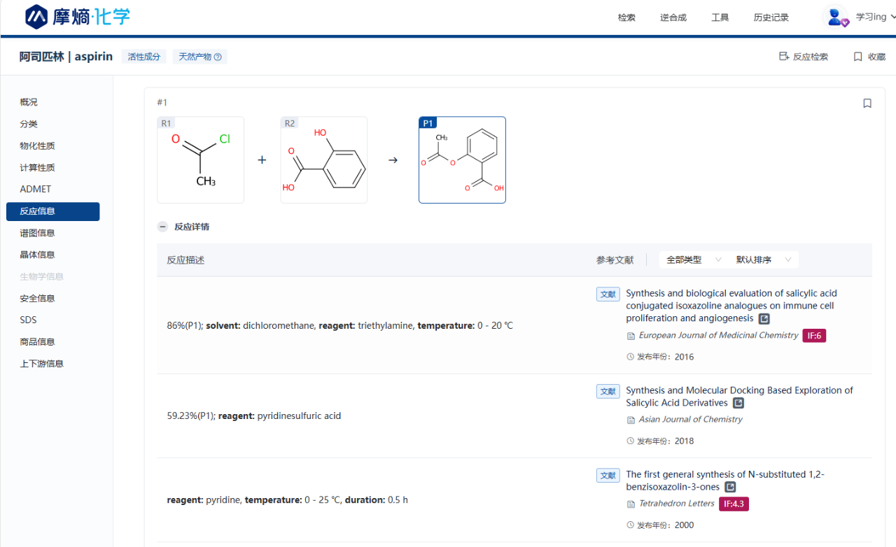 摩熵化学拥有5000万条反应数据,智能算法专业推荐优质反应,可结合丰富的物质角色、反应条件、产率、溶剂、催化剂等筛选项,对结果集精确筛选获得理想反应条件。反应数据支持溯源,完整的参考文献信息可追溯到原文,方便用户参考实现反应创新、优化合成线路。