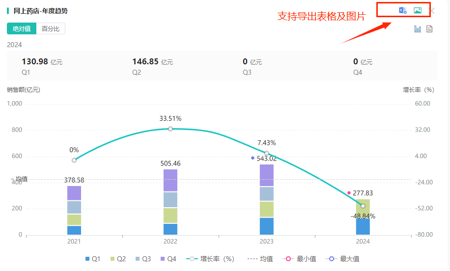 通过年度趋势分析图表,用户可以直观地观察到历年网上药店销售额与销售量的动态变化,包括增长趋势、波动幅度以及历年间的对比情况,有助于企业把握市场发展的长期趋势。