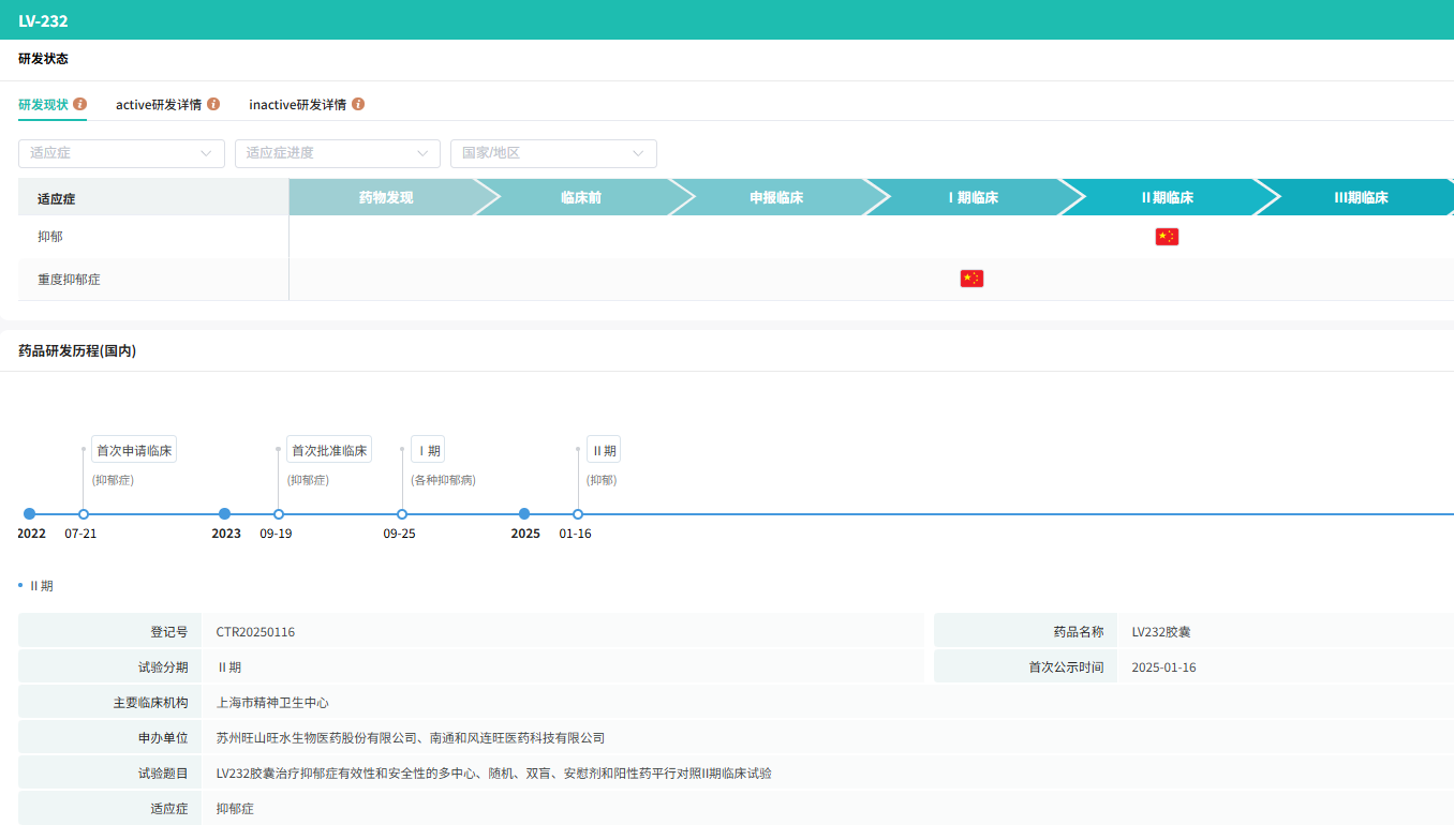 其中,LV232 是一款精神类疾病治疗药物。旺山旺水于2025年4月在中国启动了该管线用于治疗重度抑郁症的二期临床试验,并预计于2026年下半年完成试验。旺山旺水称,与目前已上市的抗抑郁药相比,LV232预计将减少胃肠道副作用,并可能提高患者的依从性。