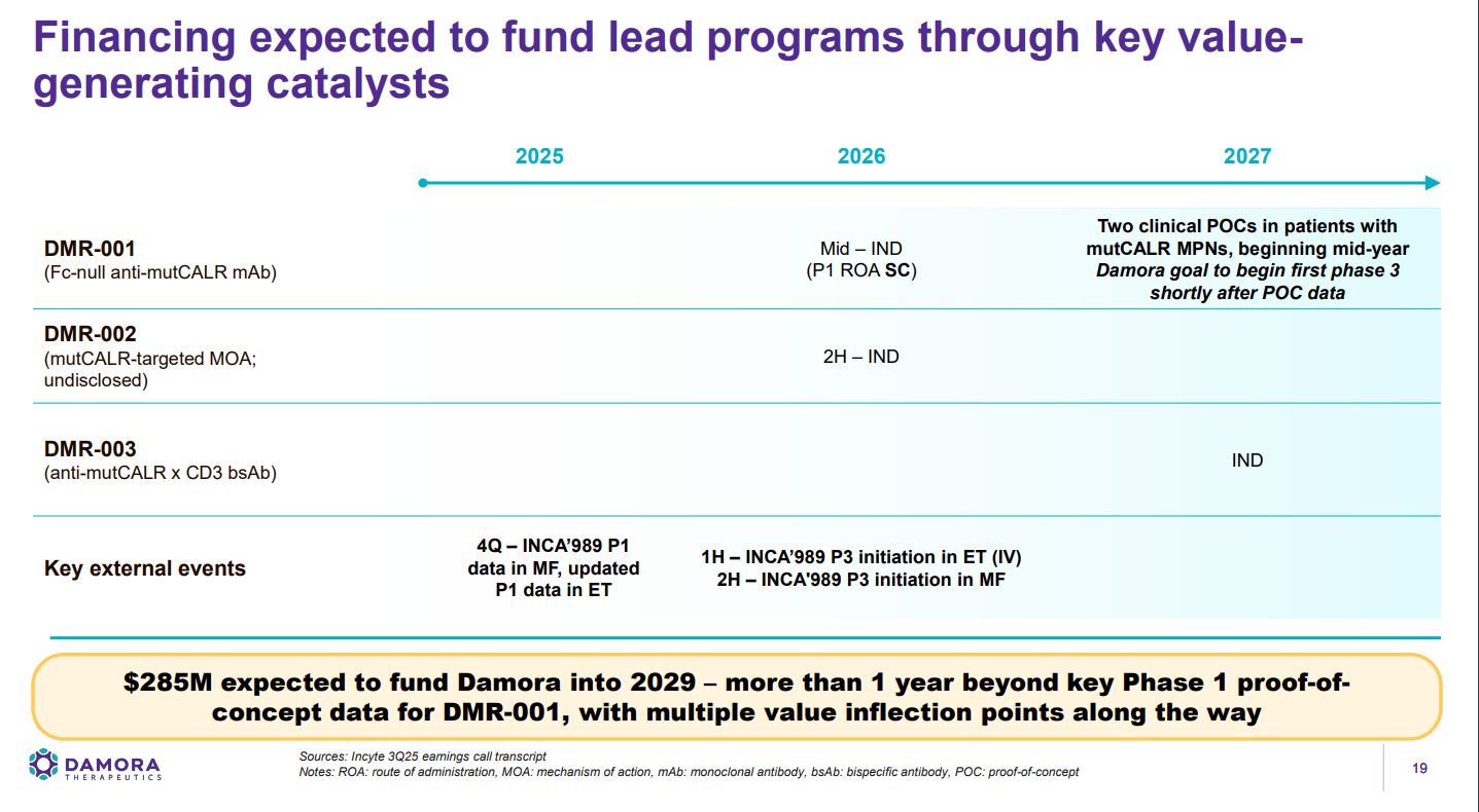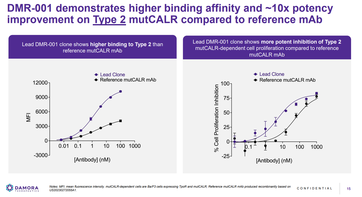 Damora是Paragon Therapeutics开发的资产所孵化出的第六家公司。DMR-001是一款潜在的同类最佳抗mutCALR单克隆抗体,在临床前模型中对1型和2型mutCALR驱动的疾病均显示出增强活性,其对2型mutCALR驱动细胞增殖的抑制效力比内部参考分子(已处于临床开发阶段)高约10倍,支持其覆盖ET和MF中全部mutCALR突变谱的潜力。DMR-001采用已验证的半衰期延长技术设计,可实现低频、小剂量、皮下给药。预计将于2026年中期提交IND申请,并计划通过皮下途径首次进入人体试验。