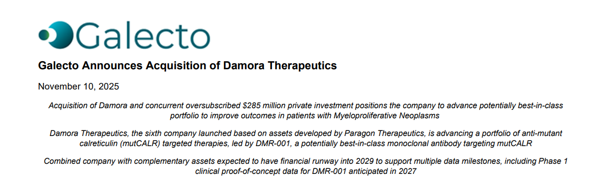 2025年11月10日,Galecto宣布完成对Damora Therapeutics的收购。