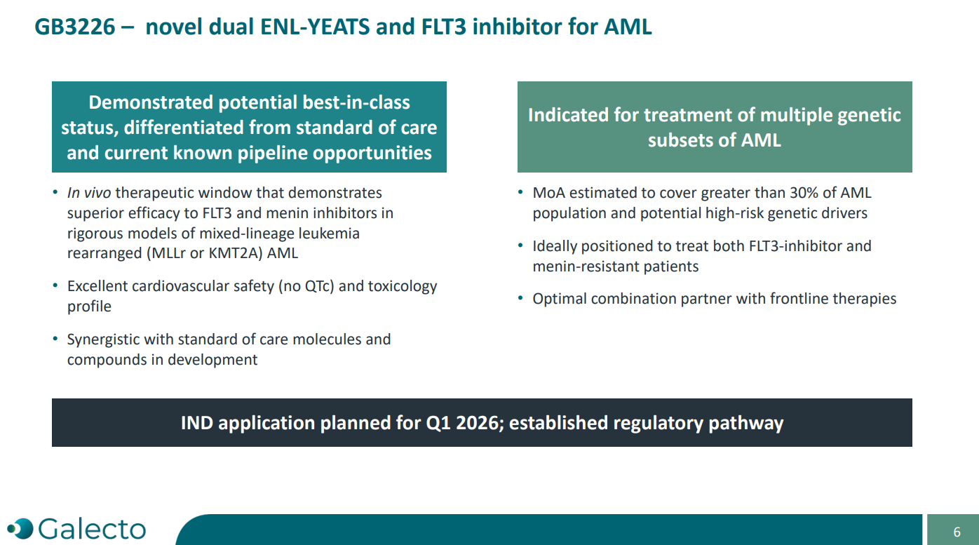 此外,Galecto还将把这些新获得的互补管线资产与其在研候选药物 GB3226 相结合。GB3226 是一种双重ENL-YEATS与FLT3抑制剂,适用于多种基因亚型的急性髓系白血病(AML)。GB3226的pre-IND申请收到美国FDA的积极反馈,并计划于 2026年第一季度递交IND申请,以启动GB3226在AML中的后续临床评估。