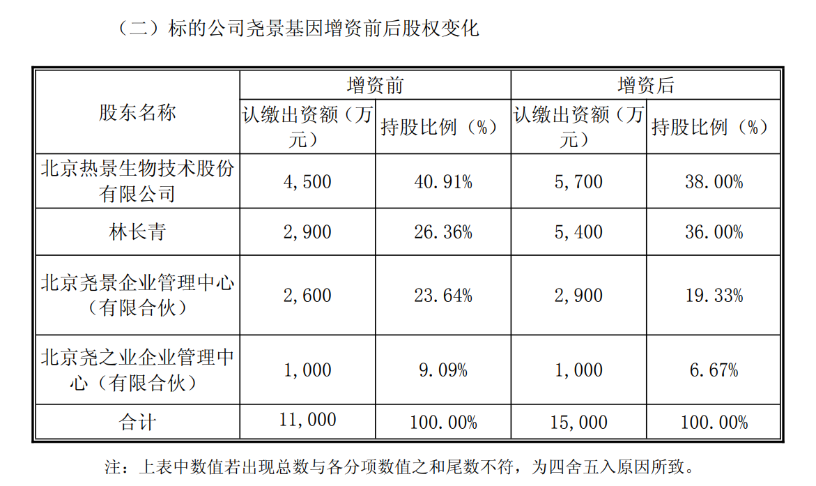 12月2日,热景生物发布公告宣布:公司与林长青、北京尧景企业管理中心(有限合伙)(以下简称“尧景合伙”)拟共同对北京尧景基因技术有限公司(以下简称“尧景基因”)进行增资,增资方案为热景生物出资2,400万元,林长青出资5,000万元,尧景合伙出资600万元,合计出资8,000万元,按照 2元/注册资本的价格进行增资。