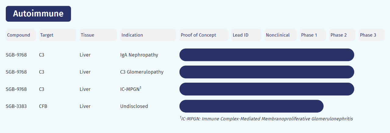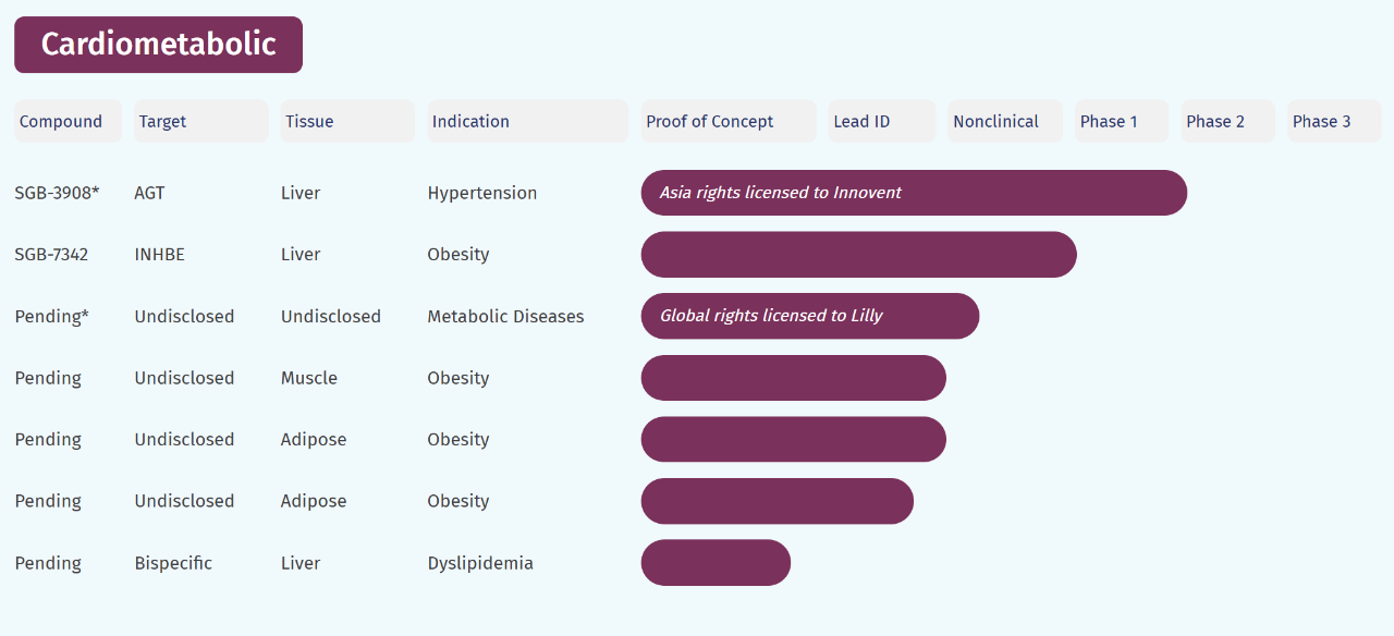 圣因生物已建立快速增长的在研产品管线,目前已有4款临床阶段候选药物(1项临床II期,3项临床I期)及多个临床前管项目。公司秉持明确的愿景:开发具有“Best-In-Class ”和“First-In-Class”潜力的创新疗法,推动RNAi疗法成为广泛疾病领域的临床标准治疗方案,为全球患者带来新一代的变革性治疗选择。