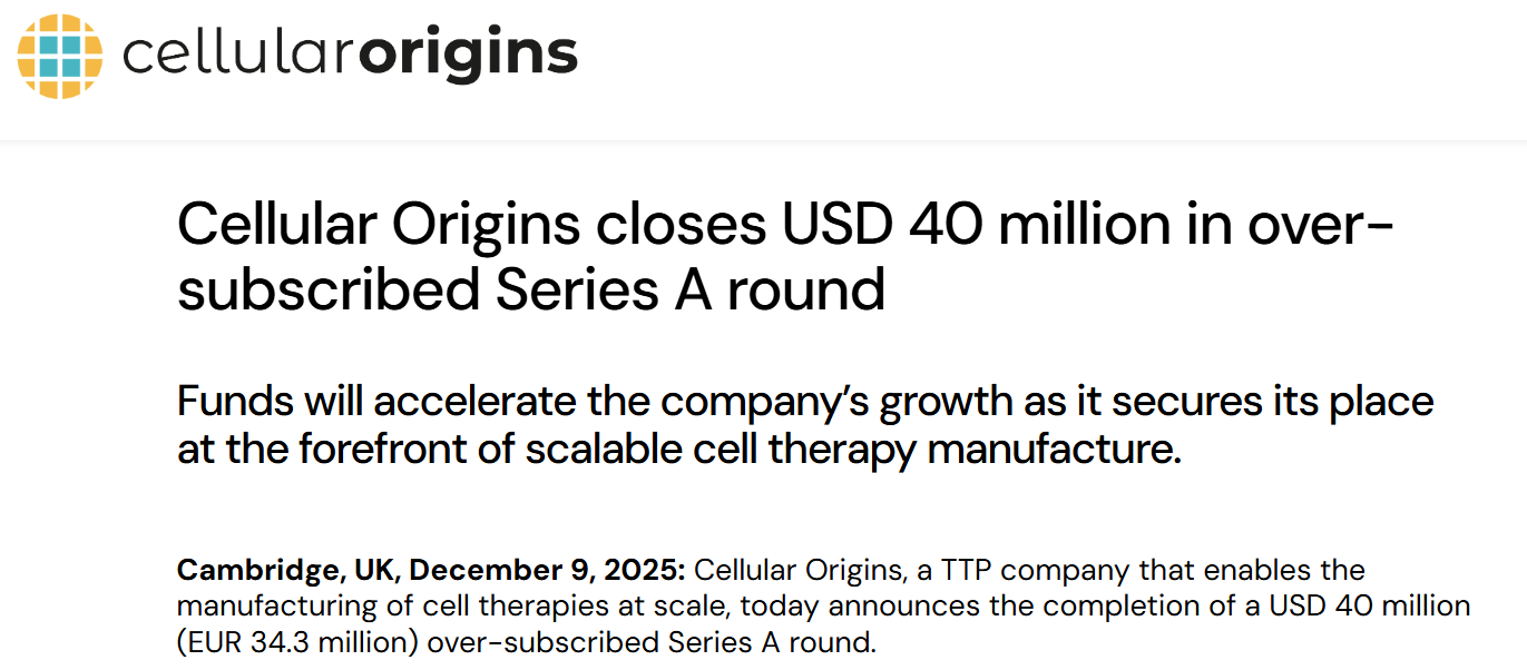 12月9日,一家隶属于TTP集团、致力于细胞疗法的生物技术公司Cellular Origins宣布,已完成一轮超额认购的4000万美元(约合3430万欧元)A轮融资。