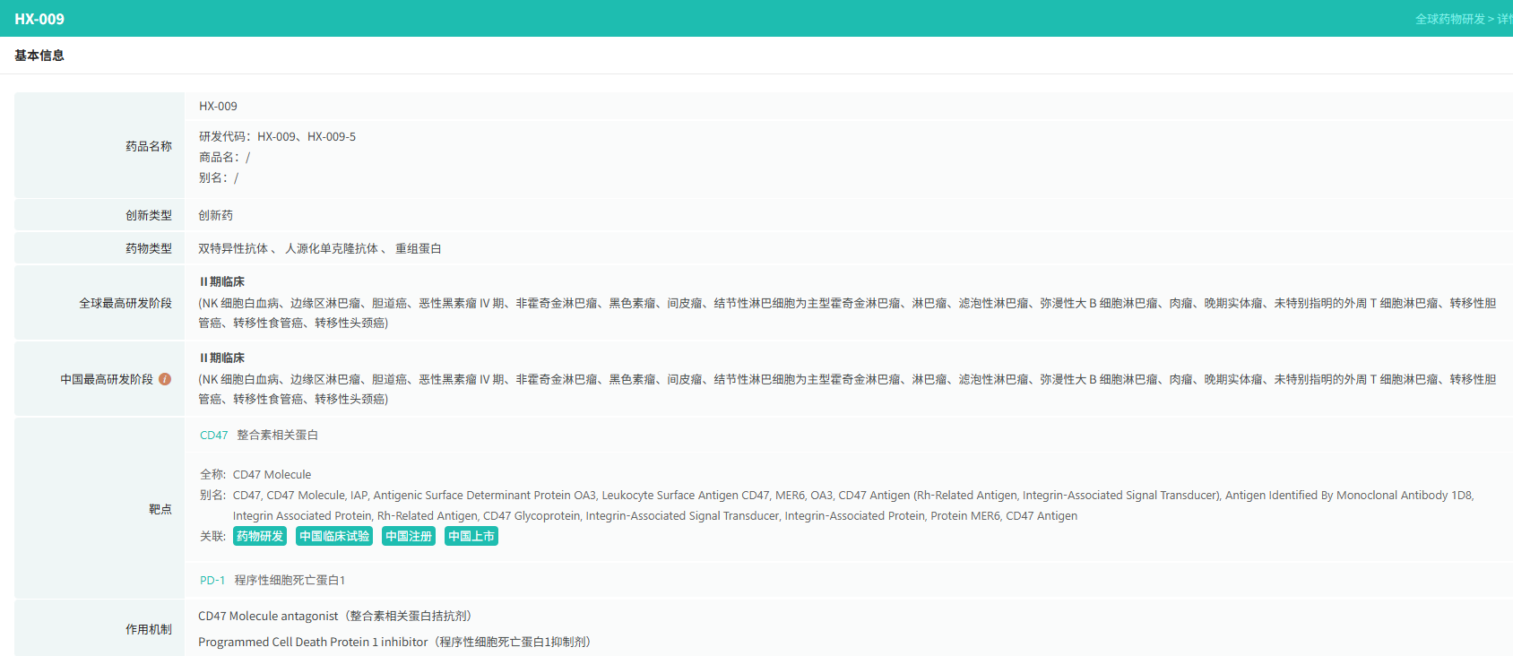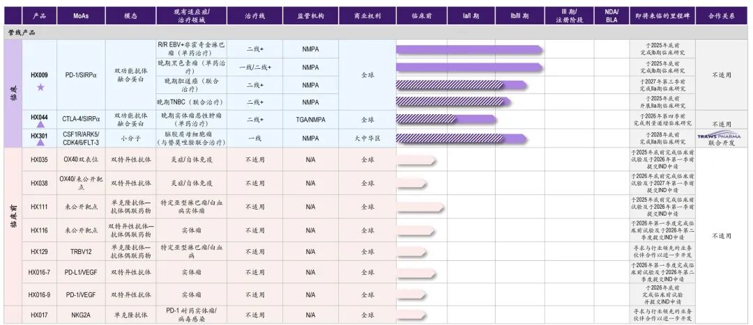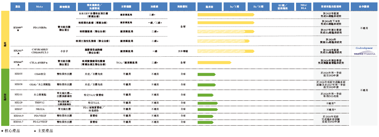 候选新药中的核心产品 HX009 (一种自主研发的PD-1/SIRPα双功能抗体融合蛋白),以及两款主要产品 HX044 及 HX301 ,以及7项临床前阶段候选药物,包括针对自身免疫和肿瘤市场的抗体偶联药物、BsAb及mAb。