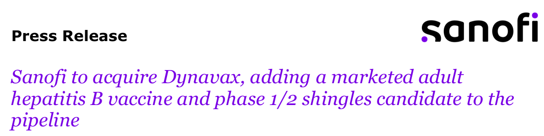 12月24日,赛诺菲宣布以22亿美元收购Dynavax Technologies Corporation(NASDAQ:DVAX),一家上市疫苗公司,拥有一种已上市的成人乙型肝炎疫苗(HEPLISAV-B®)和一种差异化带状疱疹候选疫苗。此次收购通过将Dynavax的疫苗与赛诺菲的全球规模、开发能力和商业影响力结合起来,增强了赛诺菲在成人免疫领域的影响力。