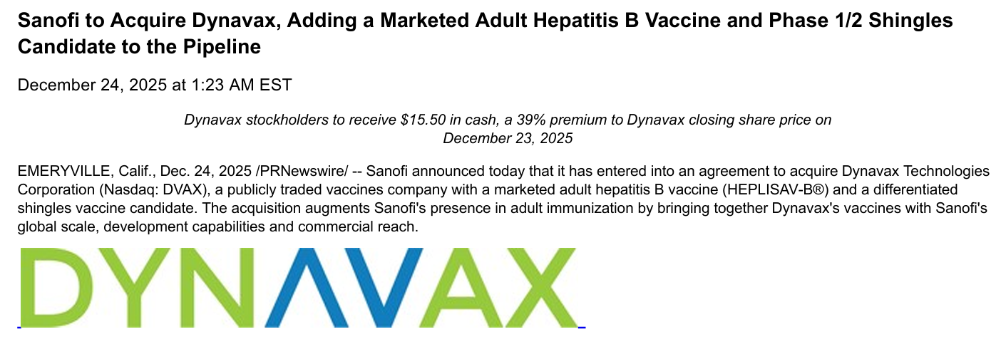 根据合并协议的条款,赛诺菲将开始现金收购要约,以每股15.50美元的现金收购Dynavax的所有已发行股份,总股本价值约为22亿美元。该报价比Dynavax在2025年12月23日的收盘价溢价约39%,比截至2025年12日的Dynavax 3个月成交量加权平均价格溢价约46%。