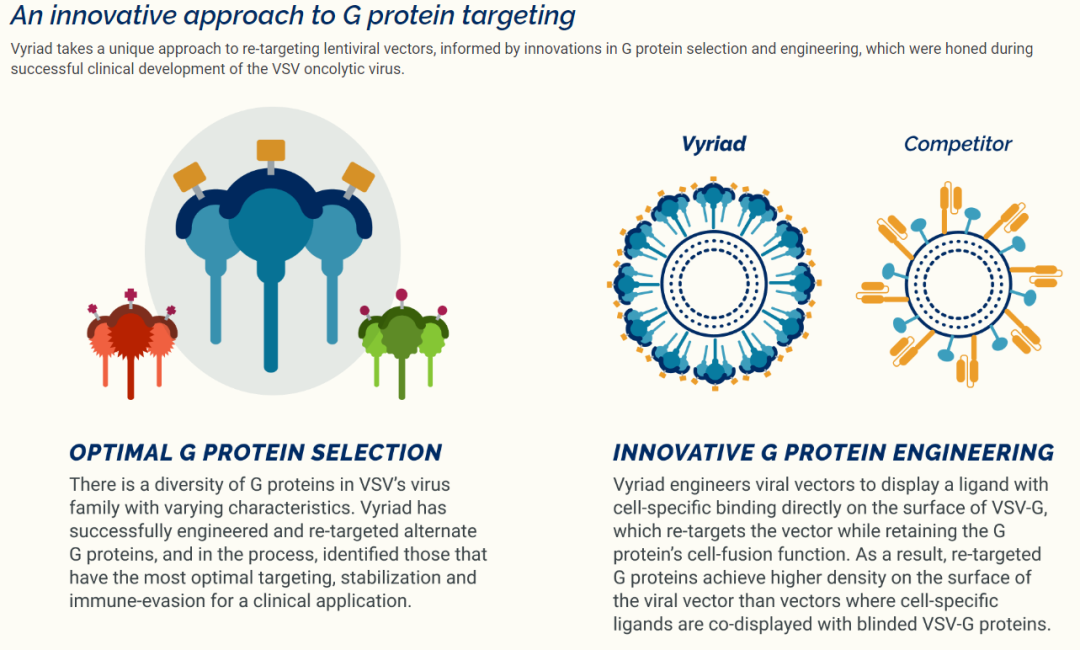 Vyriad 的慢病毒平台利用工程化 G 蛋白,可在不影响转导效率的前提下, 实现精准、直接的体内CAR 递送。该平台兼具高特异性、血液稳定性和低免疫原性,无需复杂的体外生产。由此产生的可扩展解决方案显著扩大了 CAR-T 疗法的患者群体。