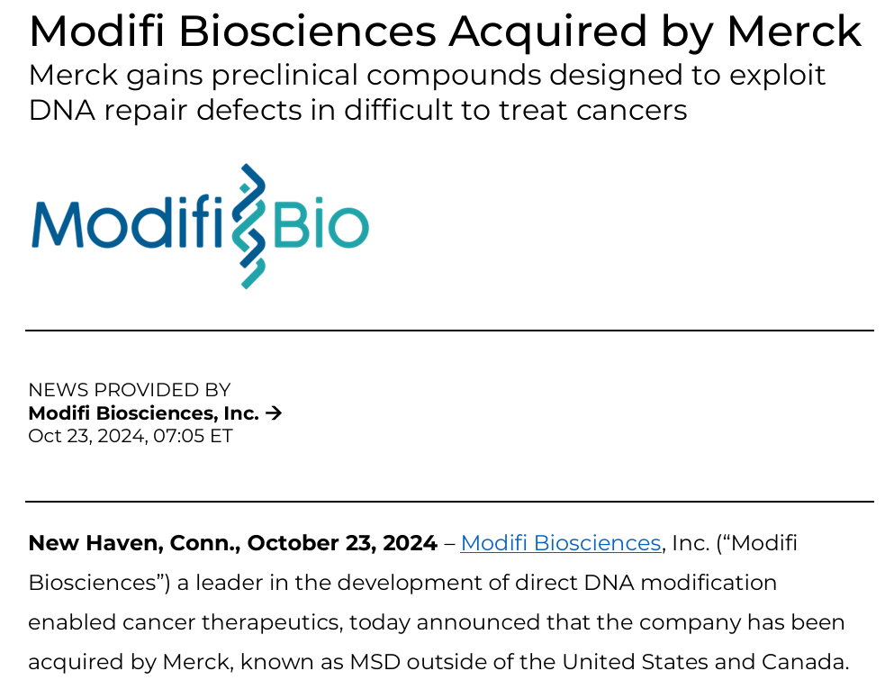 默沙东研究实验室发现肿瘤学副总裁 David Weinstock 博士表示,DNA 修复缺陷是肿瘤细胞的常见标志,也是对癌症治疗产生耐药性的主要原因,优秀的 Modifi Biosciences 团队开发了一种创新方法,我们相信这种方法有可能治疗一些最难治的癌症类型。