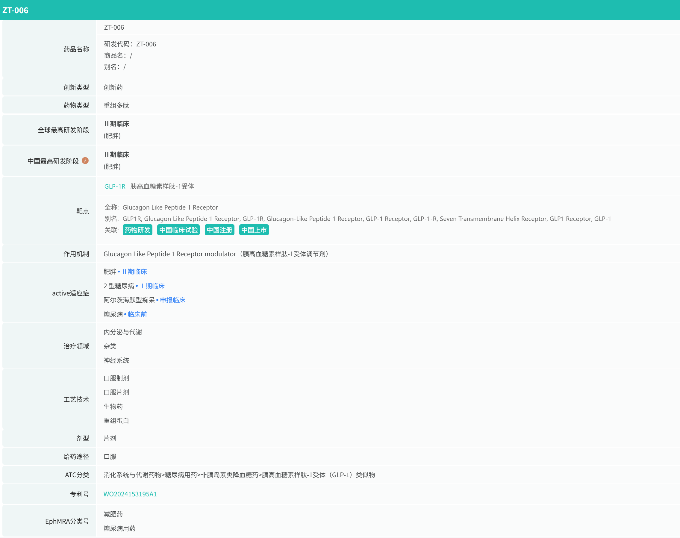 口服多肽GLP-1受体激动剂ZT006片剂正在中国开展减重II期临床研究;其创新型GLP-1/FGF21双靶点激动剂ZT003注射液,正在澳洲开展I期临床试验。公司的司美格鲁肽生物类似药ZT001已经分别与通化东宝和爱美客在糖尿病、减重适应症上展开合作。