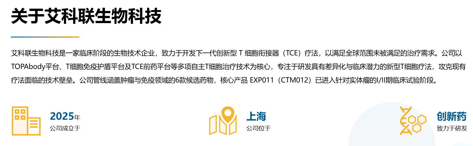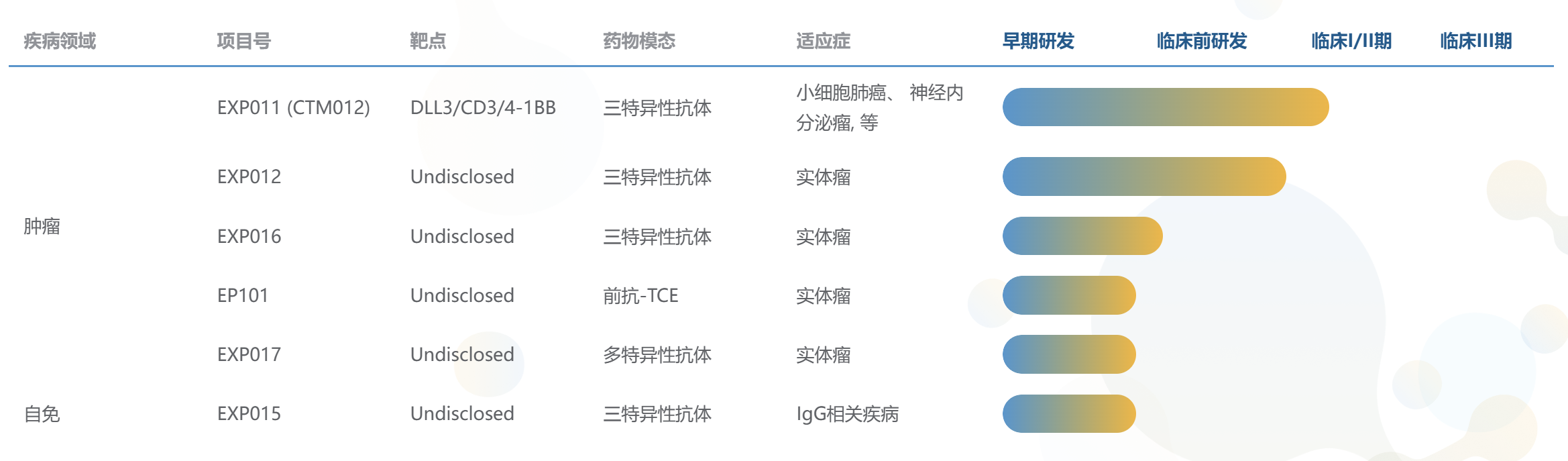 - EXP012(CTM013):一款靶向 CDH17、CD3 及 4-1BB 的三特异性TCE,拟用于结直肠癌、胃癌及胰腺癌的治疗。