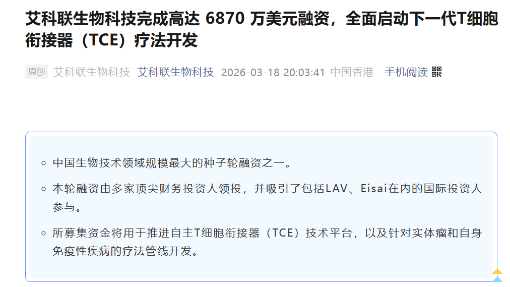 3月18日晚间,专注于研发肿瘤与自身免疫性疾病下一代T细胞衔接器(TCE)疗法的生物技术企业艾科联生物科技(Excalipoint Therapeutics) 宣布公司已顺利完成超额认购的6870万美元融资,这是中国生物技术领域规模最大的种子轮融资之一。所募资金将用于推动其自主技术平台及差异化TCE管线的开发。