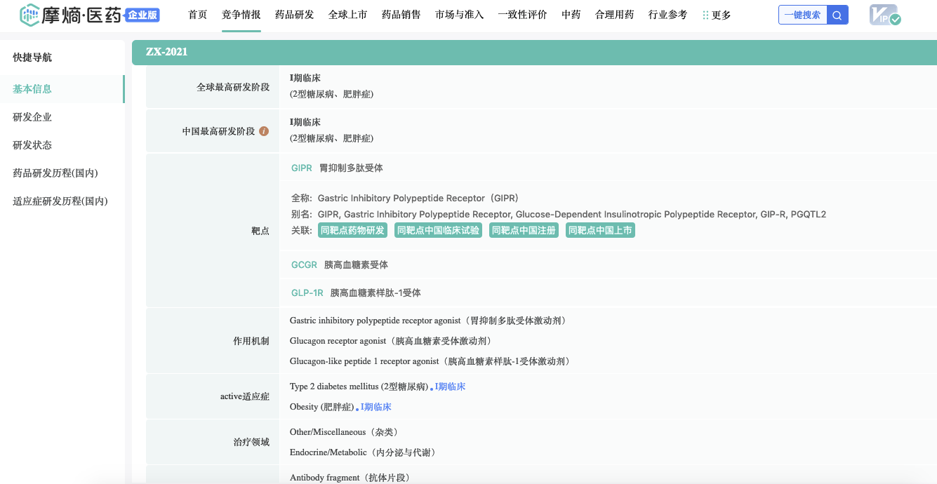 中新医药是生物药新药研发公司,目前聚焦代谢性疾病及神经系统疾病领域,已获取4个创新药的6个临床批件,皆进入临床阶段。据摩熵医药数据库显示:其中,ZX2021为Fc融合的GLP-1/GIP/GCG三重受体激动剂,ZX2010为Fc融合的GLP-1/GIP双重受体激动剂。
