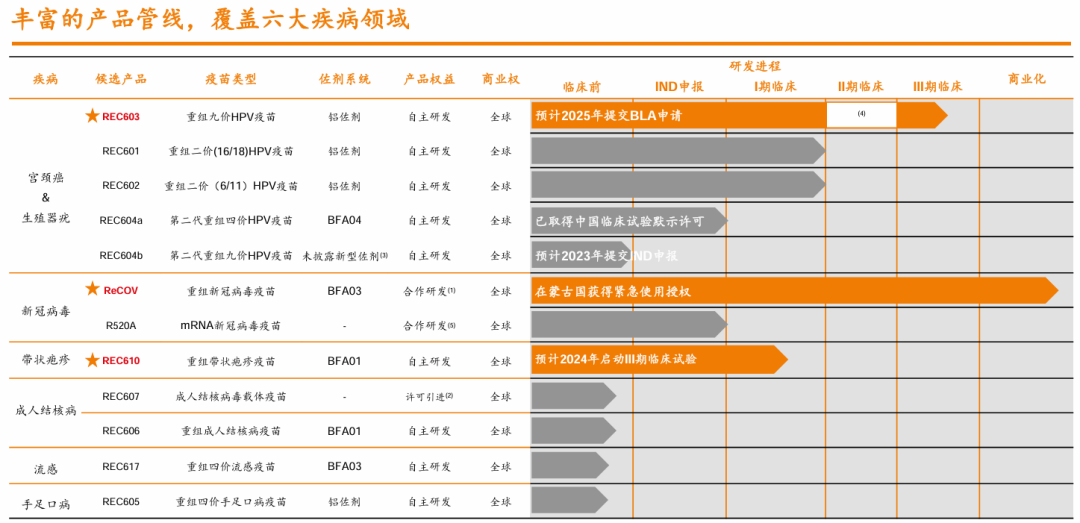 2024年10月23日,瑞科生物研发的新佐剂重组带状疱疹疫苗REC610已于近日正式启动中国III期临床研究,并完成首批受试者入组。III期临床研究旨在评估REC610疫苗对40岁及以上健康受试者的保护效力、安全性及免疫原性。REC610搭载公司自主研发的新型佐剂BFA01,可促进产生高水平的VZV糖蛋白E(gE)特异性细胞免疫和体液免疫,拟用于在40岁及以上成人中预防带状疱疹。(预防用3.3类生物制品申报)