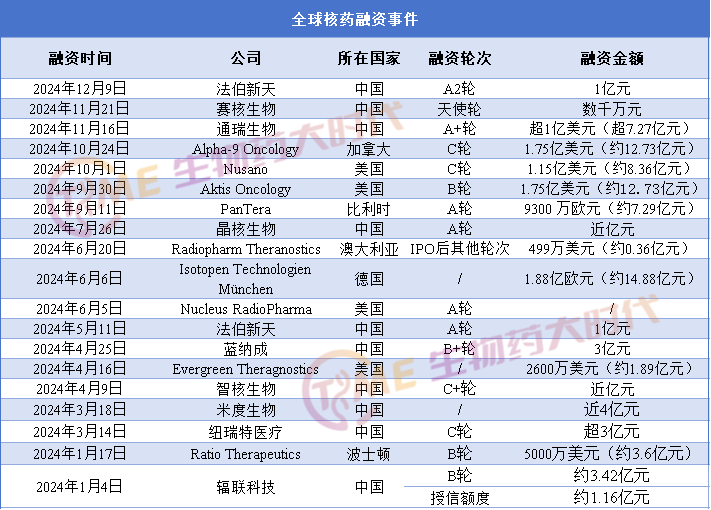 据不完全统计,2024年迄今为止全球发生约19起核药融资事件,其国内约有10起。