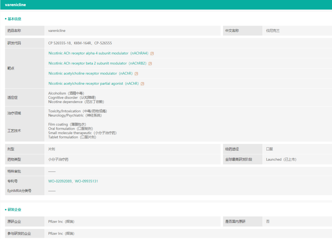 4月23日,国家药监局官网显示,江苏豪森药业的4类仿制药酒石酸伐尼克兰片顺利获批,视同通过治疗和疗效一致性评价,为国内首家。伐尼克兰是烟碱型乙酰胆碱受体 α4β2 亚型的选择性部分激动剂,对神经中该受体具有高度亲和力。伐尼克兰与 α4β2 受体结合产生激动作用,同时阻断尼古丁与该受体结合,这是伐尼克兰发挥戒烟作用的机制。伐尼克兰原研药物由Pfizer公司研制开发的酒石酸伐尼克兰(商品名:畅沛® Champix®)于2006年FDA批准在美国上市,2008年在中国批准上市,适用于成人戒烟的一种新型非尼古丁替代类药物。
