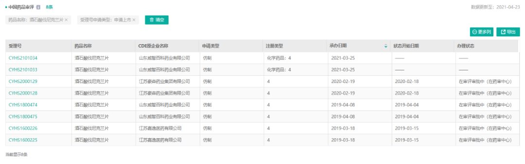 根据药融云数据显示,目前国内尚无伐尼克兰仿制药获批上市。江苏嘉逸医药于2019年3月率先按新4类提交了酒石酸伐尼克兰片上市申请,并被纳入优先审评。之后豪森药业和山东威智百科药业也提交该药上市申请。此前,豪森药业的酒石酸伐尼克兰片获批,视同通过一致性评价,成为首家。