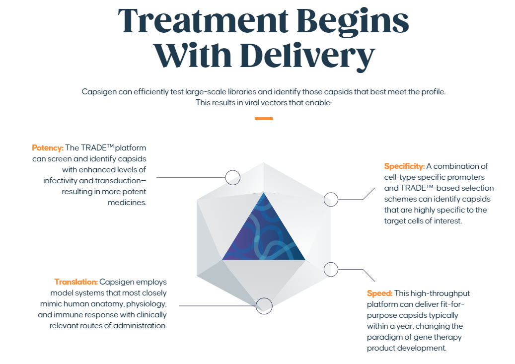 Capsigen正在开发下一代AAV载体,以推动未来的基因治疗需求。我们的端到端平台使用最符合临床需求的模型和给药途径,使用定制的高度多样化的文库。我们专有的TRADE™技术消除了背景,并采用新颖的选择策略来仅识别功能齐全且符合特定疾病转导标准的载体。最终结果是适合目的的载体,旨在以快速,高通量的方式提供最高水平的临床实用性。