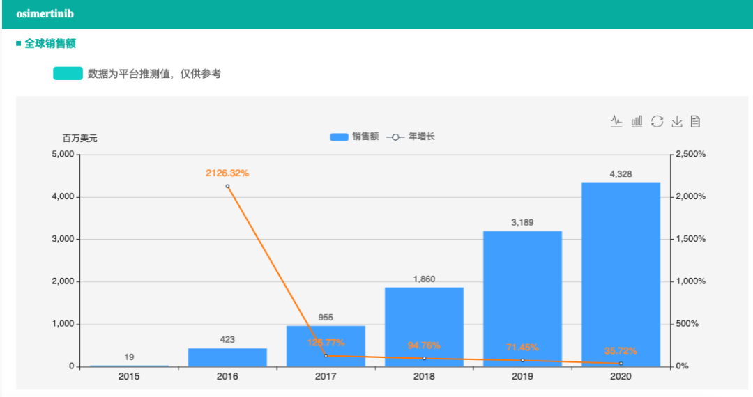 三代EGFR抑制剂泰瑞沙(奥希替尼)2020年全球销售收入达43.28亿美元,同比增长36%(目前在中国医保谈判降价后,50mg规格的奥希替尼年费用降低至6.8万元人民币)。2019财年:泰瑞沙(奥希替尼)全球销售收入达31.89亿美元。2021年Q1,根据最新季报,本品销售额达11.49亿美元,同比增加13%。