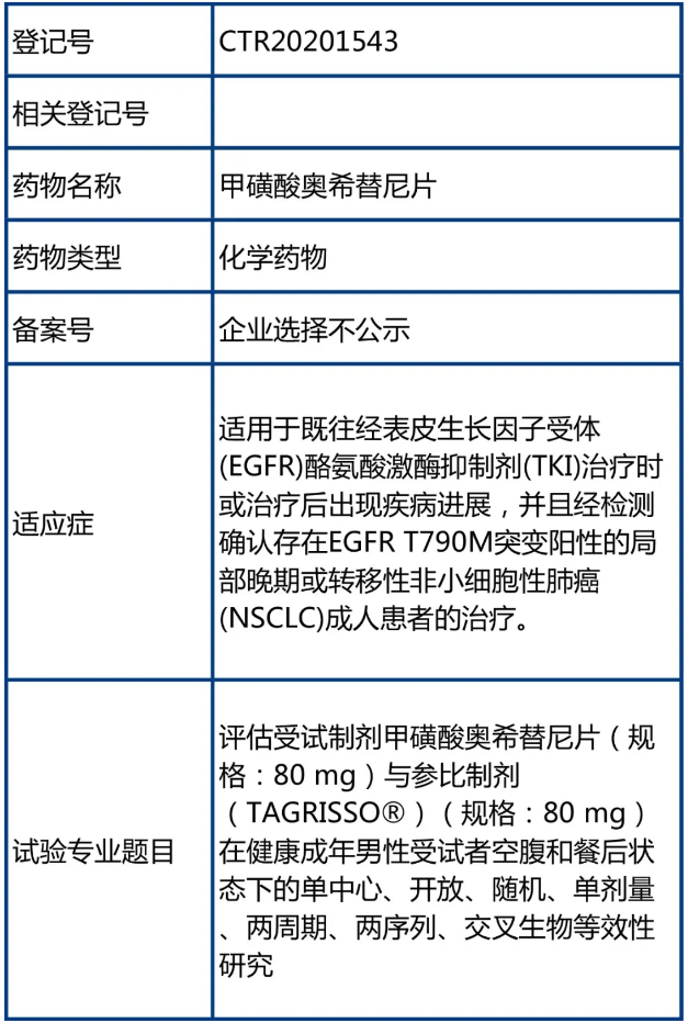 其中一项BE,本次BE主要试验目的:研究空腹和餐后状态下单次口服受试制剂甲磺酸奥希替尼片(规格:80 mg,江苏万邦生化医药集团有限责任公司生产)与参比制剂甲磺酸奥希替尼片(TAGRISSO®,规格:80 mg;AstraZeneca AB生产)在健康成年男性受试者体内的药代动力学特征,评价空腹和餐后状态口服两种制剂的生物等效性。次要试验目的:研究受试制剂甲磺酸奥希替尼片(规格:80 mg)和参比制剂甲磺酸奥希替尼片(TAGRISSO®)(规格:80 mg)在健康成年男性受试者中的安全性。