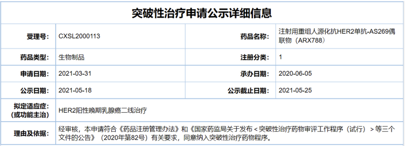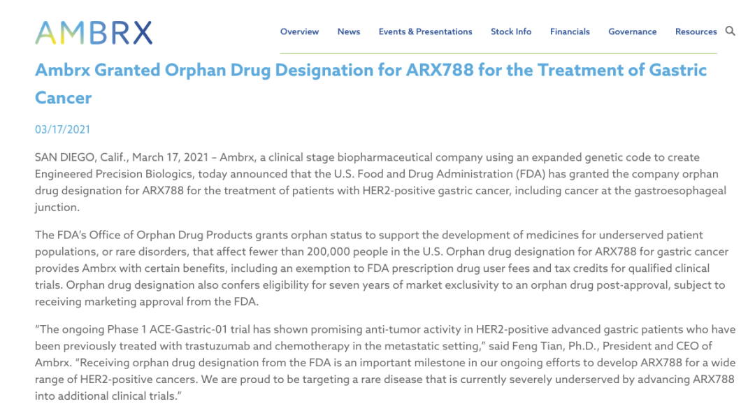 ARX788已在2021年1月获得美国FDA授予快速通道资格,用于治疗已接受过一种或多种抗HER2治疗的晚期或转移性HER2阳性乳腺癌;并于2021年3月获得FDA授予孤儿药资格,用于治疗HER2阳性胃癌和胃食道结合部癌。