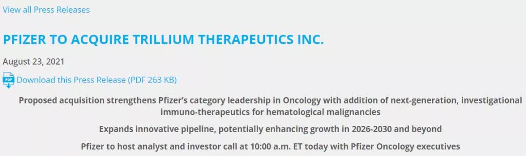 辉瑞公司和 Trillium Therapeutics Inc.宣布,两家公司已达成最终协议,根据协议,辉瑞将收购 Trillium,这是一家临床阶段的免疫肿瘤公司,开发创新疗法用于癌症的治疗。根据协议条款,辉瑞将以 22.6 亿美元或每股 18.50 美元的现金隐含股权价值收购所有尚未由辉瑞拥有的 Trillium 流通股。这比 Trillium 的 60 天加权平均价格溢价 118%。