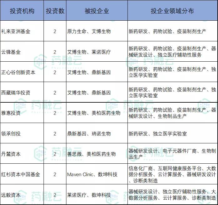 六、云峰、礼来亚洲等9家机构投资数超2笔