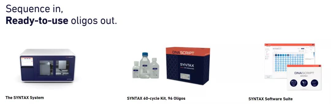 DNA Script 去年 6 月宣布有针对性地发布 SYNTAX 系统,这是一款台式仪器以及软件和试剂盒。SYNTAX 平台为各种规模的实验室提供内部 DNA 打印 - 无需使用有毒有机化学品或第三方 DNA 服务提供商的延长交付等待时间。全自动仪器可在 15 分钟内完成设置,并在几小时内产生多达 96 个可立即用于基因组学和分子生物学研究的寡核苷酸。SYNTAX 平台可提高工作流程的效率和控制力,从而提高实验室的生产力以加速创新。
