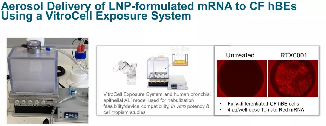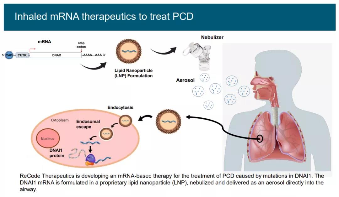 ReCode 的主要项目专注于遗传性呼吸系统疾病 PCD 和 CF。最近来自公司基于 RNA 的 CF 项目的临床前数据表明,其 LNP 可以传递 CFTR mRNA,在 CF 患者衍生的 hBE 细胞模型中恢复囊性纤维化跨膜电导调节器 (CFTR) 功能。公司用于治疗 PCD 的基于 mRNA 的吸入计划的临床前数据表明,其 LNP 制剂成功地将 DNAI1 mRNA 递送至 hBE、小鼠和 NHP 的靶向气道上皮细胞,并且在处理过的 DNAI1 缺陷型 hBE 细胞中恢复了强大的纤毛活性。