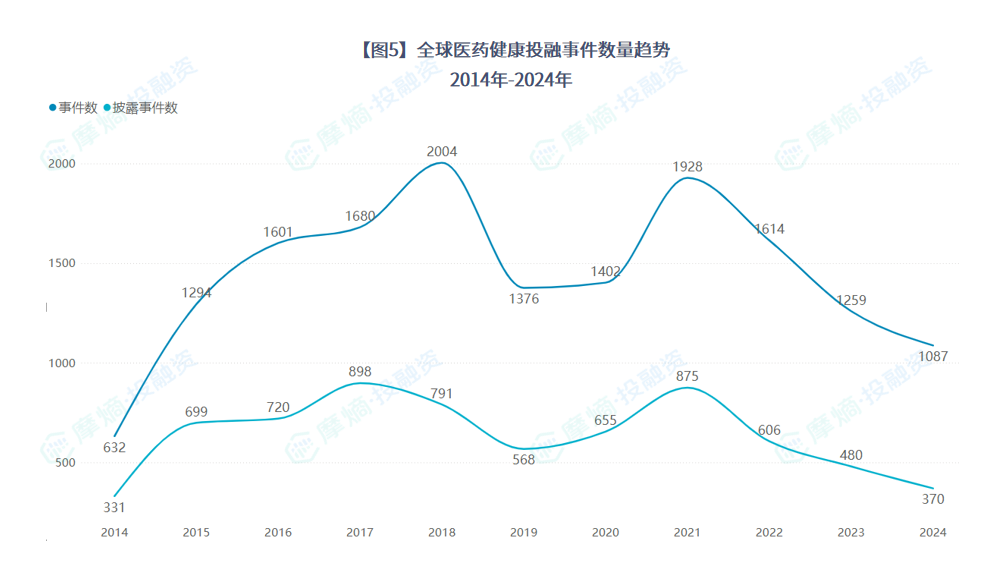 据摩熵投融资数据统计,2024年中国医药健康行业共发生投融资事件事件事件1087起,同比减少13.66%,其中披露详细披露事件370起,涉及金额超1331亿人民币。