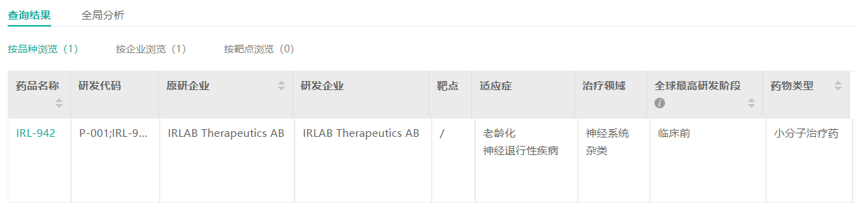 据药融云数据库显示,Integra Therapeutics 有一款药品正处于临床前阶段,是一款针对老龄化、神经退行性疾病的药品——IRL-942。