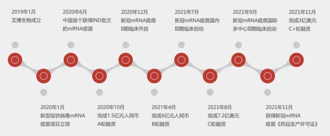 2021年11月29日,艾博生物宣布完成3亿美元的C+轮融资。本轮融资由软银愿景基金联合原股东五源资本共同领投,Chimera Abu Dhabi、富海成长基金、金镒资本、新风天域、IMO Ventures、未来资产集团、DNE资本等跟投。本轮融资将支持艾博生物加速新冠mRNA疫苗产品的临床开发和国际化步伐,结合人工智能等跨界技术,进一步提升mRNA平台的研发竞争力,快速扩充临床管线,扩大产能,全面提速商业化布局。