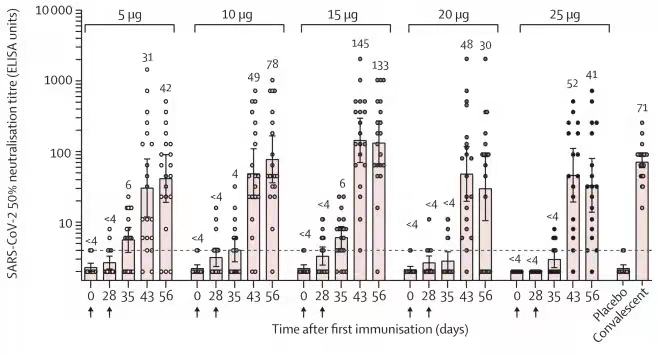 本次I期临床试验旨在评估编码新冠病毒刺突蛋白(S蛋白)受体结合域(RBD)的mRNA疫苗ARCoV的初步安全性、耐受性和免疫原性。该研究分为5μg、10μg、15μg、20μg、25μg共5个剂量组,共有120名受试者入组。研究数据显示首剂接种至全程免疫后28天内未发生严重不良事件。全身不良反应以发热最为常见,大多数受试者的发热症状在接种疫苗后的2天内消失。