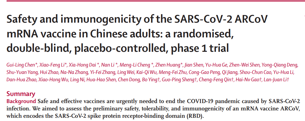 就在2022年1月24日,The Lancet Microbe (柳叶刀新创立的子刊)期刊在线发表了艾博生物、军事科学院军事医学研究院、沃森生物共同研制的新冠mRNA疫苗ARCoV的I期临床试验结果。本次单中心、双盲、随机、安慰剂对照、剂量递增的I期临床试验由李兰娟院士(多款新冠疫苗/药物)领导,在浙江杭州的树兰医院完成。