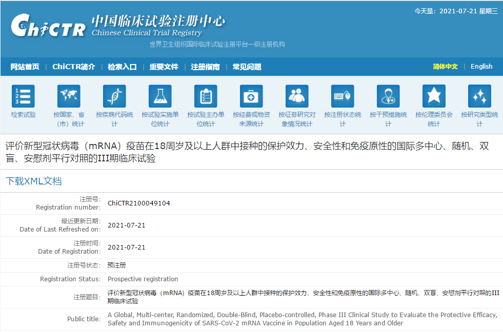 2021年7月21日,中国临床试验注册中心(ChiCTR)数据显示,《评价新型冠状病毒(mRNA)疫苗在18周岁及以上人群中接种的保护效力、安全性和免疫原性的国际多中心、随机、双盲、安慰剂平行对照的III期临床试验》预注册登记,此外还有几项临床。沃森生物mRNA新冠疫苗第三剂加强针临床试验获国家局批准。