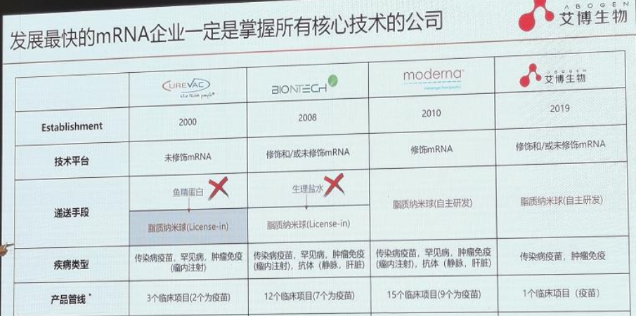 我们也期待艾博生物做出更多的mRNA相关药物,做到国际上去。药融云数据(www.pharnexcloud.com)显示,国内在开发mRNA药物的企业有:南京奥罗生物科技有限公司(远大旗下)、斯微生物、启辰生生物科技有限公司、从Strand Therapeutics引进新药及技术平台的百济神州、嘉晨西海、苏州圣诺、深信生物、峨巍医药、广州锐博生物、蓝鹊生物、本导基因、厚存纳米、珠海丽凡达(被艾美疫苗收购)、瑞吉生物、Rinuagene、美诺恒康生物、新合生物、迈科康生物、鼎新基因、深圳近邻生物、荣灿药业、佑嘉医药等等。