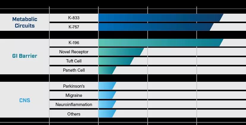 Kallyope 建立了一个高度原创的平台,该平台集成了多种用于发现和转化肠脑生物学的复杂技术。胃肠道是人体内最大、最容易接近的药物靶点。通过揭示肠道和大脑之间的联系,Kallyope 平台已被用来生成跨越多个相关治疗领域的新项目,包括新陈代谢、免疫学和炎症以及中枢神经系统疾病。Kallyope 策略的一个关键要素是用肠道限制分子靶向肠道和肠脑生理学,这是一种全新的方法,有望提高药物发现和开发的速度和成功概率。