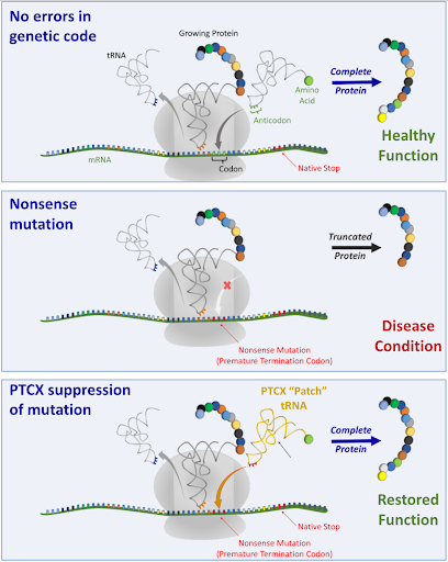 hC Bio 正在推进两个互补的平台。一种是在“无义突变”或提前终止密码子 (PTC) 导致蛋白质功能障碍时恢复蛋白质功能,这一问题占所有人类疾病的 10-15%。该平台称为 PTCX(“Patch”),采用 tRNA 抑制遗传密码中的此类错误,从而产生适当的全长蛋白质。